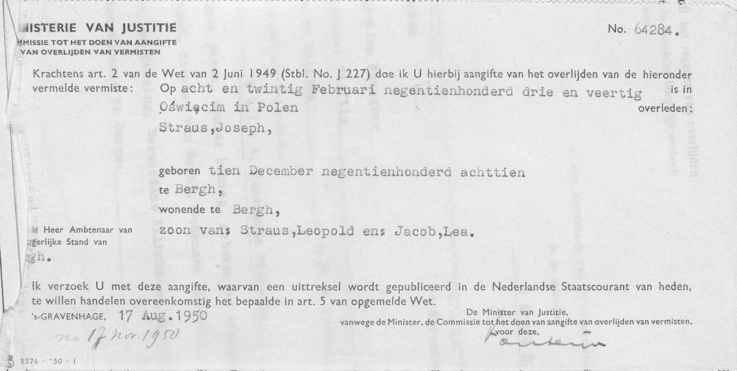 De officiële mededeling No. 64284 van de Commissie tot het doen van aangifte van overlijden van vermisten van Joseph Straus' overlijden in Auschwitz. Bron http://zoekakten.nl