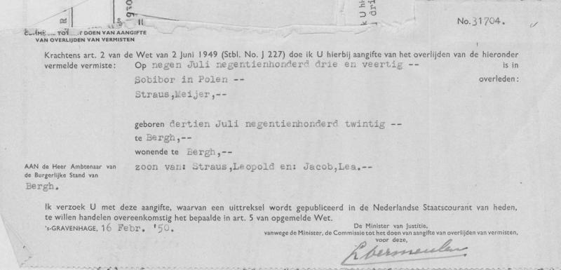 officiële mededeling No. 31704 van de Commissie tot het doen van aangifte van overlijden van vermisten van Max Straus' overlijden in Sobibor. Bron http://zoekakten.nl
