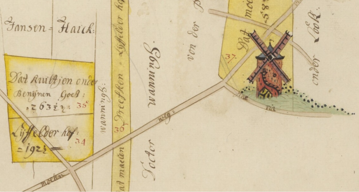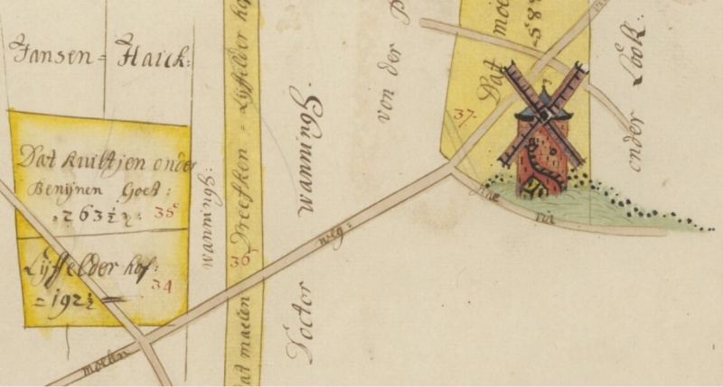 Bron: Archief Huis Bergh, inventarisnummers 3385, "Caarte van de heerlijkheid Diedam", inhoudende kaarten van de grafelijke bezittingen onder Didam, door Theod. Bucker, gezworen landmeter, 1727