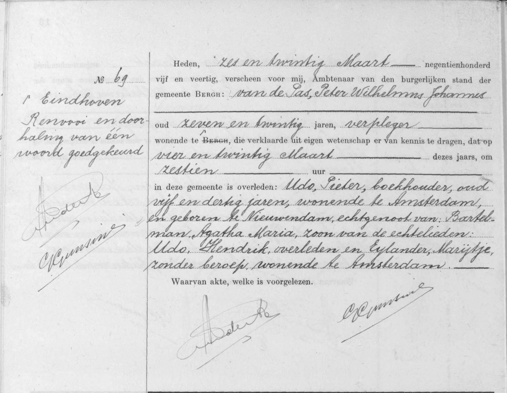 overlijdensakte van Pieter Udo, opgemaakt op 26 maart 1945 in 's-Heerenberg