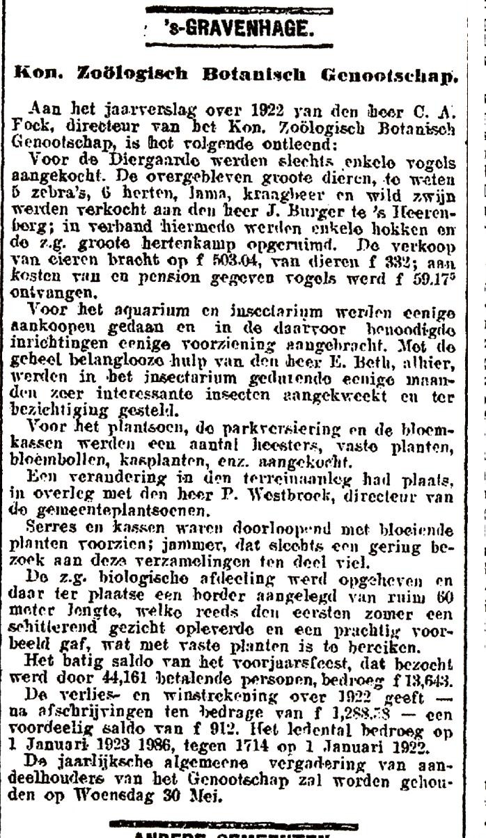 Nieuwe RotterdamseCourant 14 mei 1923 verkoop dieren aan J.Burgers