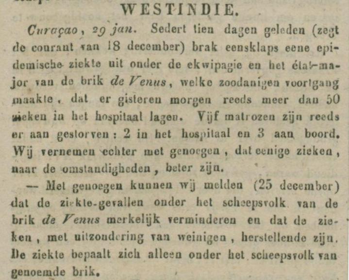 Bericht in de Arnhemsche Courant van 26 maart 1842 over ziekte aan boord van Volmer Knollaerts schip