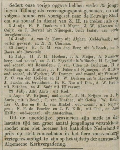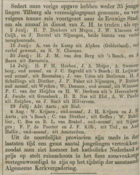 Bericht in de Tilburgsche Courant van 7 augustus 1869 dat de ’s-Heerenbergse zouaven P.C. van der Heijden en H.W. Derksen noemt.