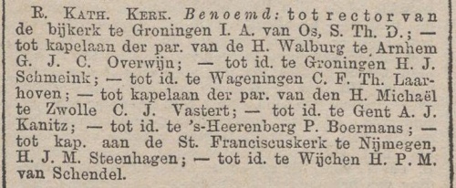 Boermans' benoeming in 's-Heerenberg werd gemeld in Het Nieuws van den Dag van 14 oktober 1887. In hetzelfde bericht zien we de benoeming in Arnhem van kapelaan Overwijn. Hij zou in 1908 pastoor in Azewijn worden.