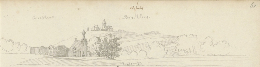 Schlösschen Borghees op een schets uit 1731 van Abraham de Haen. Op de achtergrond de Eltenberg.