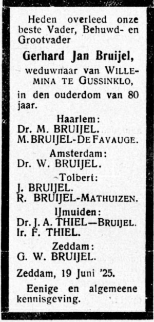 Bruijel overleed op 19 juni 1925 in Zeddam, tachtig jaar oud. Zijn vrouw was al op 20 maart 1890 op 42-jarige leeftijd in Emmerik overleden.