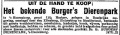 De eigenaar van het bekede dierenpark te 's-Heerenberg de heer J. Burgers is met het gemeente bestuur in onderhandeling over een terrein van 10 HA.aan de Schelmseweg bij het Museum park van het Nederlandse Openluchtmuseum van de nog van de nog aanwezige dieren ten einde daarheen zijn verzameling exotische dieren over tebrengen en er een groot landhuis te bouwen. De heer Burges heeft onlangs zijn verzamelingen sterk utgebreid door aankoop van de in de Haagse Dierentuin nog aanwezige dieren. De onderhandelingen met het gemeente bestuur zijn reeds in een vergevorderd stadium en zullen vermoedelijk spoedig tot een gunstig resultaat leiden.