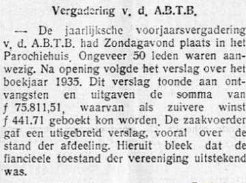 De vereniging is per notariële akte opgericht op 20 april 1942 en ontbonden per 1950 ingevolge het genomen besluit van de ledenvergadering op 1 februari 1948. Per deze datum is de vereniging overgegaan naar de Coöperatieve Aankoop-en Verkoopvereniging Beek van de A.B.T.B. G.A.