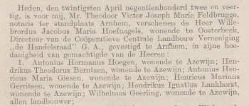Handel in Land- en Tuinbouwartikelen en al hetgeen daarmee verband houdende, zoals ruwvoer, voerartikelen, voerkoeken, verwerkt en/of onverwerkt granen, bakrogge, zaaigranen en zaaizaden, pootaardappelen en ander pootgoed, hooi en stroo, conseerveringsmiddelen, bestrijdingsmiddelen, chemicaliën, meststoffen, touwwerk, zakken, koe- en paarddekken, rietmatten, oliën en vetten, brandstoffen, turfstrooisel, landbouwwerktuigen en -machines, ijzerwaren en alle benoodigheden voor veeteelt, land- en tuinbouw in den ruimsten zin, etc.
