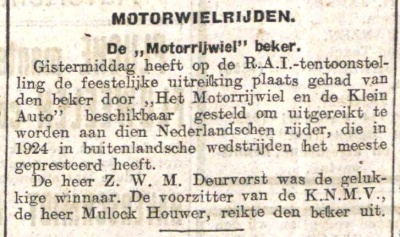 Uitreiking op 15 februari 1925 in de perskamer van de RAI in Amsterdam van de beker Aangeboden door Het Motorrijwiel en de Klein-auto aan Z. Deurvorst als KNMV-lid voor het leveren van de beste prestaties als Nederlandsch rijder in buitenlandsche wedstrijden gedurende 1924". De beker is nog steeds in het bezit van de familie Deurvorst.