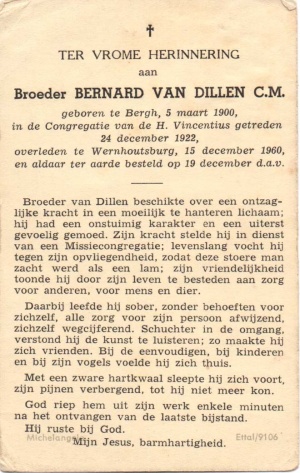 Bernardus Hermanus van Dillen, roepnaam Bernard, was kloosterling. Hij werd op 5 maart 1900 geboren in Wijnbergen als zoon van Johannes Chrisostemus van Dillen en Maria Catharina Lanters. Hij was een broer van Wesselina Catharina van Dillen.