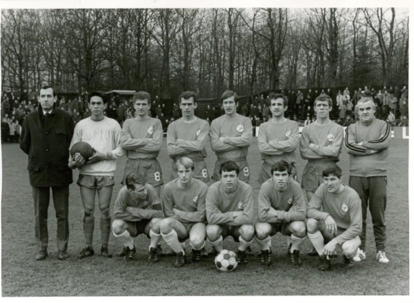 De Graafschap 1968-1969. Staand vlnr: Ad Zonderland (trainer), Joop Doornebosch, Henk “ kappertje” Overgoor, Ben Bartelink, Arie Beekman, Frans Dieter Mōllers, Dick Bruil en Jan Siebelink (verzorger). Zittend vlnr: Hennie Nieuwenhuis, Henk Koenders, Theo van Londen, Guus Hiddink en Roel Zaaijer