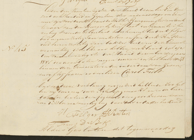 Heden Den Zesentwintigsten der Maand December Een Duizend Achthonderd en zeventien des nademiddag om Een zijn voor ons Mr Frans de Both Burgemeester en ambtenaar van Den Burgerlijken Stand der Gemeente ’s heerenberg Behorende Gelderland verschenen Hendrik Felger oud negen en Zestig Jaar winkelier en Jan Derk Rutten oud vieren Zeventig Jaar bakker beiden in Deze Gemeente woonachtig dezelfde ons hebben verklaard dat op Den vierentwintigste Der Maand December des jaars 1817 des avonds ten negen uuren in het huis no 48 binnen deze Gemeente in den ouderdom van Zeven en vijftig Jaaren is overleden Carel Fielt