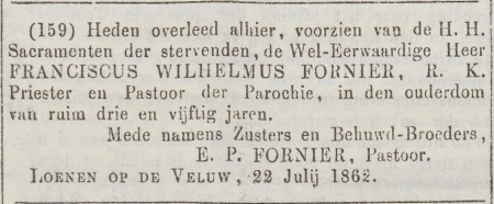 Fornier overleed in Loenen op 22 juli 1862, 53 jaar oud, en werd begraven op het kerkhof van zijn kerk. Zijn graf is daar nog aanwezig.