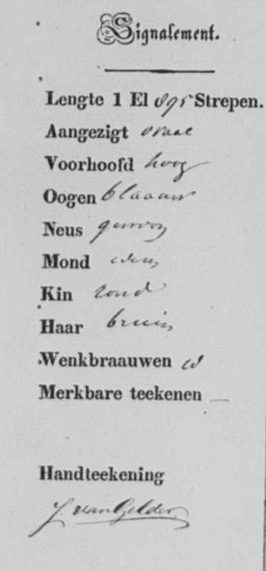 Van Gelders signalement, zoals vermeld in zijn certificaat van de Nationale Militie, laat zien dat hij 1 el en 895 strepen lang was, ofwel op 5 millimeter na 1 meter 90.