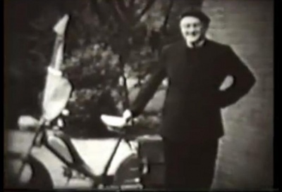 Pastoor De Greef met de nieuwe bromfiets die hij bij zijn 25-jarig priesterfeest kreeg. Beeld uit de promotiefilm van 1956.