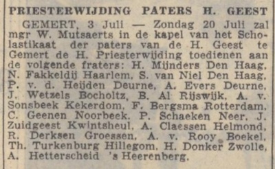 Door pater Cornielje uit Lobith enthousiast gemaakt voor de missie vertrok hij in 1939, veertien jaar oud, naar het kleinseminarie van de paters van de Heilige Geest in Weert. Op zijn beurt heeft hij zelf ook een aantal 's-Heerenbergse jongens enthousiast gemaakt voor de missie: Johan Berndsen, Antoon ten Have en Theo ten Brink werden ook pater van de Heilige Geest.