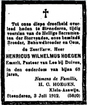 Pastoor Hoegens overlijdensadvertentie in dagblad Het Centrum van 4 juli 1912