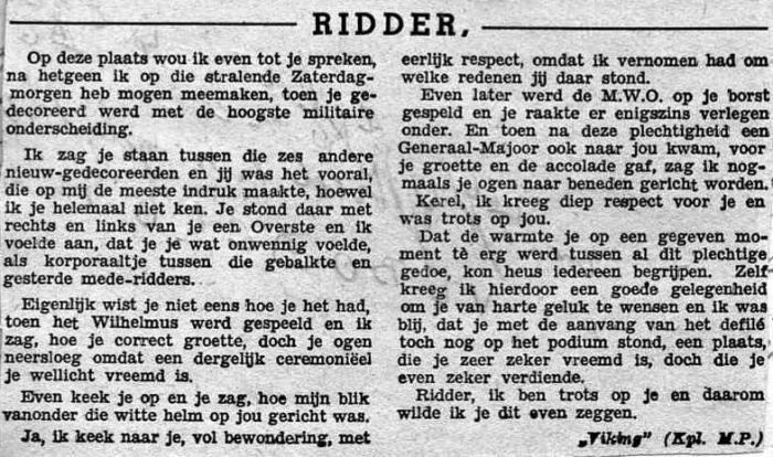 Column van "Viking" in de aflevering van Wapenbroeders - Uitgave van en voor de Nederlandse strijdkrachten in Indonesië na de uitreiking van de Militaire Willems-Orde aan korporaal De Bruin in Batavia op 19 maart 1949.