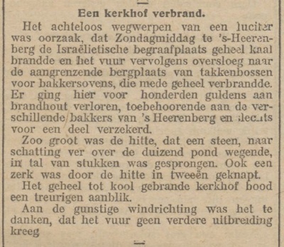 De begroeiing op de Joodse begraafplaats is een aantal keren weggevaagd door brand Toen de begraafplaats nog gebruikt werd, bestond die begroeiing vooral uit gras, dat erg lang kon worden. Bij de brand in augustus 1911 zijn ten minste twee grafstenen door de hitte verbrokkeld. De hitte werd toen verergerd door de takkenbossen die aan de rand van de begraafplaats waren opgeslagen en ook vlam hadden gevat. De vernielde grafstenen stonden waarschijnlijk dicht bij deze takkenbossen.