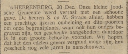 Wat voor afrastering er in 1874 om de Joodse begraafplaats werd is gezet kon niet worden achterhaald, noch hoe groot het afgerasterde grondstuk was. Uiterlijk in 1913 was een nieuw hek nodig, zoals blijkt uit de aanbesteding waarvoor Joseph Straus toen een advertentie in de krant liet zetten. De benodigde materialen had hij al, zoals het vlechtdraad. Dit was waarschijnlijk gaas zoals dat ook is gebruikt in het hek dat zijn zoons Sally en Maurits in november 1921 hebben laten plaatsen. Het is wat verwonderlijk dat er na acht jaar al een nieuw hek nodig was, maar het kan zijn dat Joseph alleen het nieuwe gedeelte heeft laten omheinen, terwijl Sally en Maurits een hek om de hele begraafplaats hebben laten zetten.