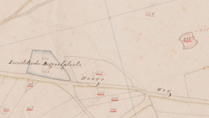 De begraafplaats op de kadastrale kaart uit 1822 met de percelen 220 en 221. Rechts (225) de molen achter het Jodenkerkhof.