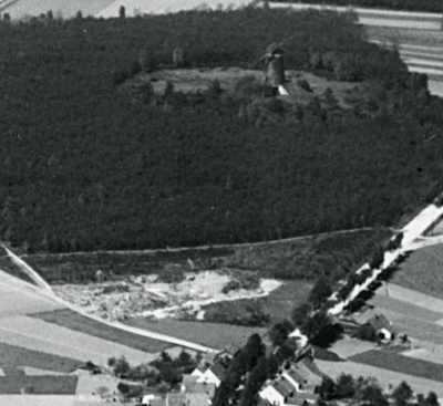Een groot deel van de algemene begraafplaats naast de Joodse begraafplaats is vanaf 1908 afgegraven voor zandwinning. De afgraving is te zien op de luchtfoto uit 1927 hieronder. De Joodse begraafplaats ligt tussen de afgraving en de weg langs de bosrand. Verder naar links staat het lijkenhuisje (zie 2.2). Heuvelopwaarts is de molen achter het Jodenkerkhof te zien.