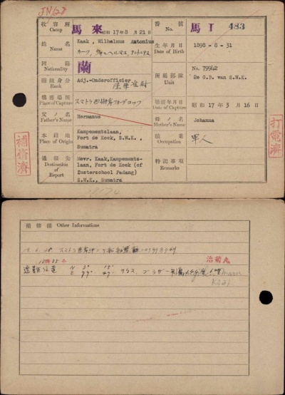 Op 21 augustus 1942 werd Kaak overgebracht naar een krijgsgevangenkamp in Medan op Noord-Sumatra. Dit was kamp № 1 van de kampen die vielen onder het gezag van de kampleiding op Malakka. Dit is linksboven op zijn interneringskaart aangegeven met het stempel 馬 来; rechtsboven staat 馬 I als aanduiding van kamp № 1.