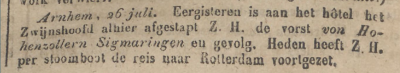 Op 22 juli 1841 is erfprins Karel Anton met zijn adjudant baron Von Esbeck uit Sigmaringen vertrokken voor een reis naar Nederland. Zij voeren per stoomboot de Rijn af en gingen op 25 juli in Arnhem van boord voor hun eerste stop in Nederland. Na overnachting in hotel Het Zwijnshoofd zetten zij hun reis per stoomboot voort naar Rotterdam. Op 29 juli kwamen zij aan in Den Haag om daar op 2 augustus deel te nemen aan de feestelijkheden ter gelegenheid van de 23e verjaardag van prins Alexander, de tweede zoon van koning Willem II. Daar waren ongetwijfeld meer gasten aanwezig, maar de kranten noemden alleen de erfprins en zijn adjudant met naam. Waren zij speciale genodigden en was een bezoek aan de Nederlandse koninklijke familie het eigenlijke doel van de reis?