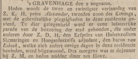 Uit de Rotterdamsche Courant van 3 augustus 1841. De leeftijd van prins Alexander (geboren in 1818) wordt hier met een jaar te weinig vermeld. |