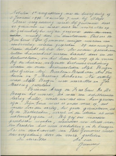 A.H. Hoegen, die bij de gedwongen opheffing in 1942 voorzitter was, opende de vergadering, waarna pater Gommers de aanwezigen met een korte toespraak aanmoedigde lid te worden. Van de veertig aanwezige gezinnen meldden er zich inderdaad 39 aan.