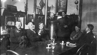 Het interieur van het café van het Stations-Koffiehuis in Zeddam rond 1930. Pim Issing, de boswachter, staat in uniform bij de potkachel. Links zitten enkele medewerkers van Staatsbosbeheer die voor (houtverkoop) naar Zeddam waren gekomen. Het Stations-Koffiehuis werd vaak door tramreizigers als wachtruimte gebruikt. |