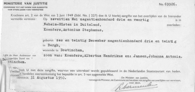 Verder is er uit Neheim-Hüsten op 2 mei 1946 een overlijdensakte verstuurd naar Didam, waar Antoon ook gewoond heeft. Deze akte is noch in Didam noch elders teruggevonden.
