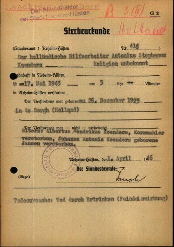 Antoons overlijden is na de oorlog twee keer geregistreerd. De eerste keer was op 6 juni 1946 in de gemeente Wijhe, waar een Sterbeurkunde uit de Duitse gemeente Neheim-Hüsten, gedateerd 5 juli 1945, was ontvangen. In Wijhe woonde een oom, die in 1937 bij het overlijden van zijn vader voogd van hem en zijn minderjarige broers en zussen werd (zijn moeder was in 1928 al overleden). Destijds was men pas met 21 jaar meerderjarig, zodat Antoon bij zijn dood nog minderjarig was. Het is niet duidelijk waarom de inschrijving in Wijhe bijna een jaar op zich heeft laten wachten. De Sterbeurkunde die hieronder is afgebeeld, is op 1 april 1946 opgemaakt. Ze zal gelijkluidend zijn met het document dat in Wijhe is ontvangen. Als doodsoorzaak wordt vermeld: Tod durch ertrinken (Feindeinwirkung). Voor Antoon zullen de Britse Dam Busters geen vijanden zijn geweest. Overigens waren zijn persoonsgegevens in Neheim-Hüsten goed bekend; zelfs zijn vaders beroep wordt vermeld: Kornmahler.