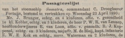 Op 23 april 1890 is hij met hem al bekende stoomschip Sumatra naar Nederland vertrokken. Volgens de passagierslijst reisde hij met zijn echtgenote. Zij heette Petronella Catharina van der Weerd en was op 13 maart 1853 geboren in Utrecht als dochter van Wilhelmus van der Weerd en Wilhelmina Josephina de Groot. Zij was vroedvrouw van beroep. In 1877 was zij getrouwd met Abraham Bedier, maar dit huwelijk werd op 12 mei 1885 ontbonden door de arrondissementsrechtbank in Den Haag. Zij waren toen al meer dan vijf jaar gescheiden van tafel en bed.