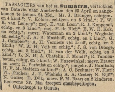 De Sumatra legde op 24 mei 1890 aan in Genua, waar Kok en zijn vrouw net als de meeste andere passagiers van boord gingen en hun reis naar Nederland per zogenaamde boottrein voortzetten. Dat bekortte de reis met meerdere dagen, want de Sumatra was pas op 2 juni in IJmuiden, terwijl de trein via Duitsland al na een dag of twee in Nederland was. Een bijkomend voordeel was dat de trein in Emmerik en Arnhem stopte. Het is goed mogelijk dat Kok en zijn vrouw in een van deze plaatsen zijn uitgestapt.