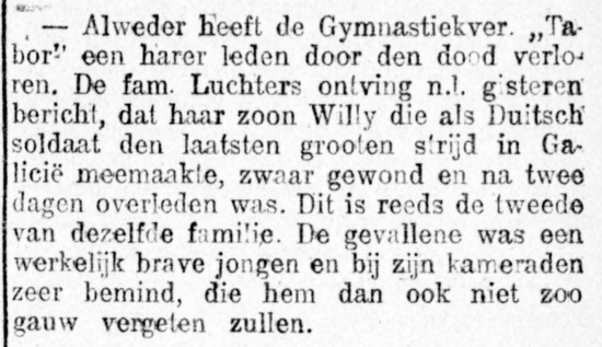 Al op 25 mei 1915 maakte De Graafschapbode melding van Willy's dood. Op dat moment woedde het Gorlice-Tarnów-offensief, dat de hele maand mei duurde. Bielcza ligt vlak bij Tarnów. In hetzelfde bericht wordt vermeld dat Willy's broer Robert een maand eerder zwaargewond raakte.
