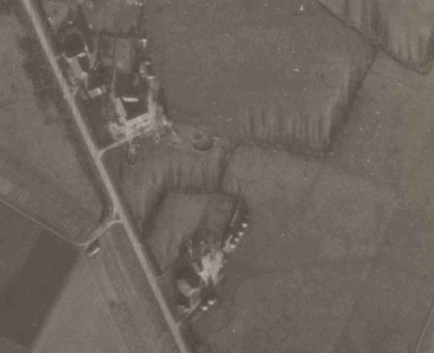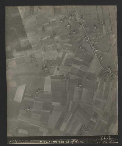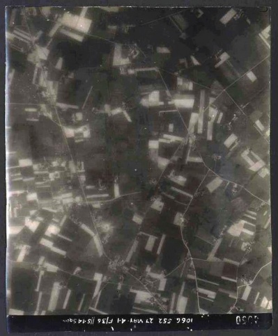 In de zomer van 2012 vond Frits onderstaande luchtfoto, die op 27 mei 1944 door een Brits fotoverkenningsvliegtuig was gemaakt. Hierop is duidelijk de krater te zien die een bom uit het neergestorte vliegtuig een paar dagen eerder heeft geslagen. De luchtfoto is te vergroten door er meermaals op te klikken. Aan de hand van bijgevoegde kaart is de krater dan gemakkelijk te vinden; hij ligt net onder het de naam Passegoed.