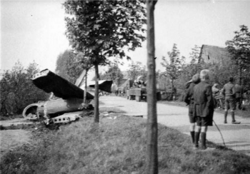 "Een aangeschoten vliegtuig viel na het uitwerpen van fosfor- en andere bommen bij Bulsink en Von der Linden in de wei en brandde uit en een huis werd met de grond gelijk gemaakt. Overal waren de ruiten kapot en de dakpannen eraf. 't Was zomer. De zes piloten lagen dood in de wei en de koeien stonden eraan te likken. Maar de moffen stonden met het geweer in de aanslag op wacht. Geen koe mocht de wei uit, geen lijk mocht weggehaald worden die dag. Later zijn die zes vliegeniers op het kerkhof zonder militaire eer begraven, iets wat Mardon, die twee jaar eerder was verongelukt, wel ten beurt was gevallen."