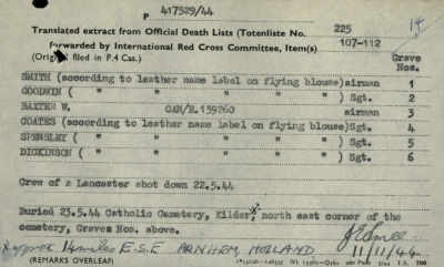 De graven van de zes vliegeniers zijn na de oorlog door officieren van de RAF geopend om de identiteit van elk van hen te bevestigen. Volgens de gegevens van het Rode Kruis, hadden de Duitsers de namen van de doden afgeleid van de leren naamplaatjes op hun uniform. Alleen bij Baxter was dit gedaan op basis van zijn legernummer, zoals uit nevenstaande vertaling van een uittreksel uit Totenliste No. 225 blijkt.