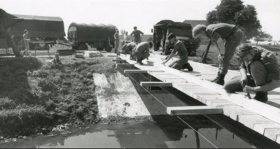 De bouw van de Linthorsterbrug door Duitse militairen van het 140ste pioniersbataljon van de Maurits van Nassau kazerne uit Emmerik.