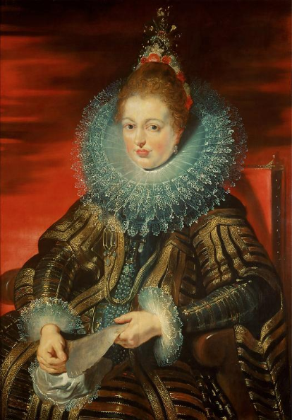 - Haar japon wijst erop dat het portret rond 1620 in de Brusselse hofkring gemaakt moet zijn. Van 1613 tot 1625 werd Maria Elisabeth Clara inderdaad in het Brusselse paleis van landvoogdes Isabella opgevoed. De schilder Pieter Paul Rubens maakte rond dezelfde tijd een portret van landvoogdes Isabella in een vergelijkbare japon. Opvallend zijn de wijde, los-afhangende overmouwen, en de kanten molensteenkraag en manchetten van hetzelfde ontwerp. Het portret van de landvoogdes hangt nu in het Kunsthistorisches Museum in Wenen. Wie het portret van Maria Elisabeth Clara schilderde is niet bekend; het is immers niet gesigneerd. Mogelijk is het van Cornelis de Vos (1584–1651), die af en toe met zijn tijdgenoot Rubens heeft samengewerkt.