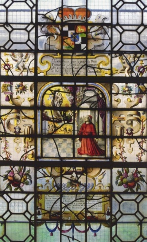 Onderaan staan zijn naam en zijn wapen en de naam van zijn vrouw en haar wapen. Beide zijn getooid met een Fürstenhut, zoals die ook voorkomt op het gebrandschilderde raam hieronder.