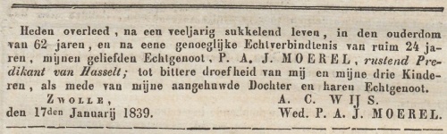 Overlijdensbericht uit de Overijsselsche Courant van 22 januari 1839.