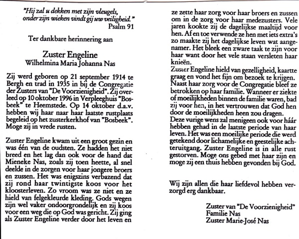 Wilhelmina Maria Johanna Nas, roepnaam Mina of Mieneke, was religieuze. Zij werd op 21 september 1914 geboren in Loerbeek als dochter van Bernardus Albertus Nas en Engelina Maria Jansen.