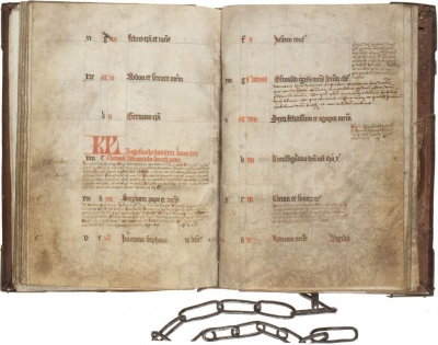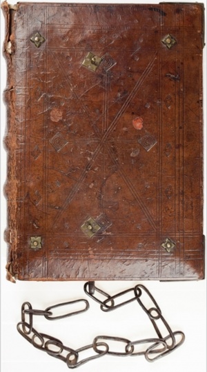 Het voorplat is beslagen met vier koperen knoppen, en het achterplat met zes knoppen. Midden op het voorplat zitten bovendien twee koperen pinnen; elk om een lintje aan vast te maken waarmee het boek dichtgebonden kon worden. De lintjes zijn echter niet meer aanwezig. De al genoemde ketting aan het achterplat bestaat uit veertienlangwerpige schakels. Op de hoeken zitten hoekbeschermingen.