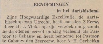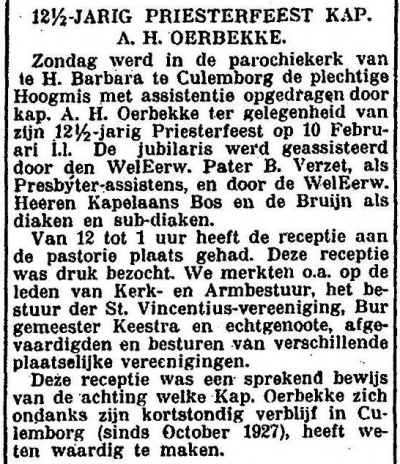 Twee jaar later, in oktober 1927, werd Oerbekke kapelaan in Culemborg. Hoelang hij daar is geweest, kon nog niet worden achterhaald. Mogelijk heeft hij nog andere standplaatsen gehad voor hij in november 1936 werd benoemd tot pastoor in Cabauw in de Lopikerwaard. Daar overleed hij op 15 november 1943, 53 jaar oud.