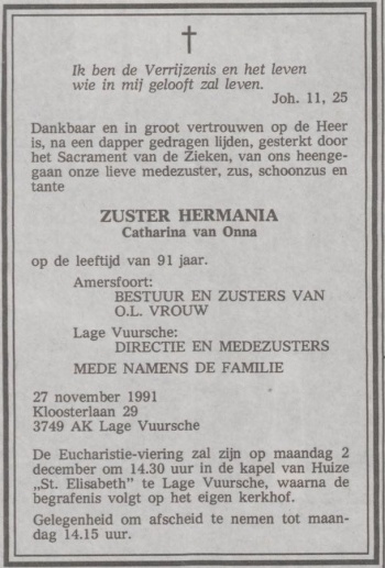 Zuster Hermania overleed op 27 november 1991, 91 jaar oud, in Huize Sint Elisabeth, het verpleeghuis van de congregatie in Lage Vuursche. Op 2 december werd zij begraven op de r.-k. begraafplaats achter Huize Sint Elisabeth.