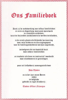 De samensteller is John Thoben, die het heeft gedrukt in zijn eigen drukkerij Thoben Offset in Nijmegen. De presentatie van het boek vond plaats in Beek op 19 oktober 1985. De gegevens in het boek komen uit de bestanden van de Stichting voor Genealogie en Geschiedenis tussen Rijn en IJssel.