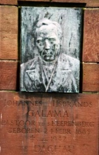 Johannes IJsbrands Galama, pastoor te 's-Heerenberg, geboren 24 februari 1885, overleden 20 juni 1942 te Dachau (Op het monument staan puntjes, omdat de juiste sterfdatum niet bekend was toen het werd gemaakt.) |